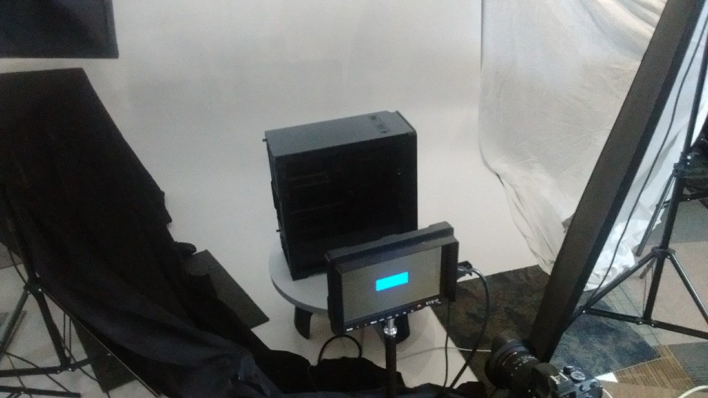 The solution? Set up every black backdrop, popup, and reflector we had in a semicircle around the turntable/cyc backdrop – and lift up the soft box lights on the stands so that they lit the case over these negative fills. The camera was stuck through hole in this semicircle: